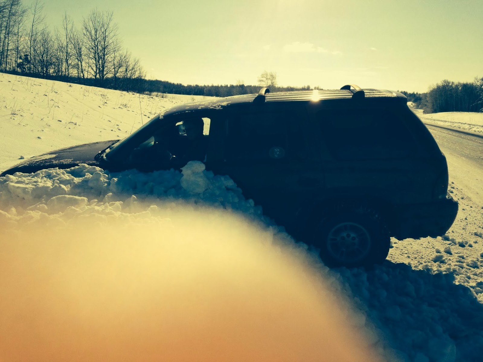 Fisherhubby could open his door so he got out to take these pix while I called 9-1-1 to beg for a tow truck.